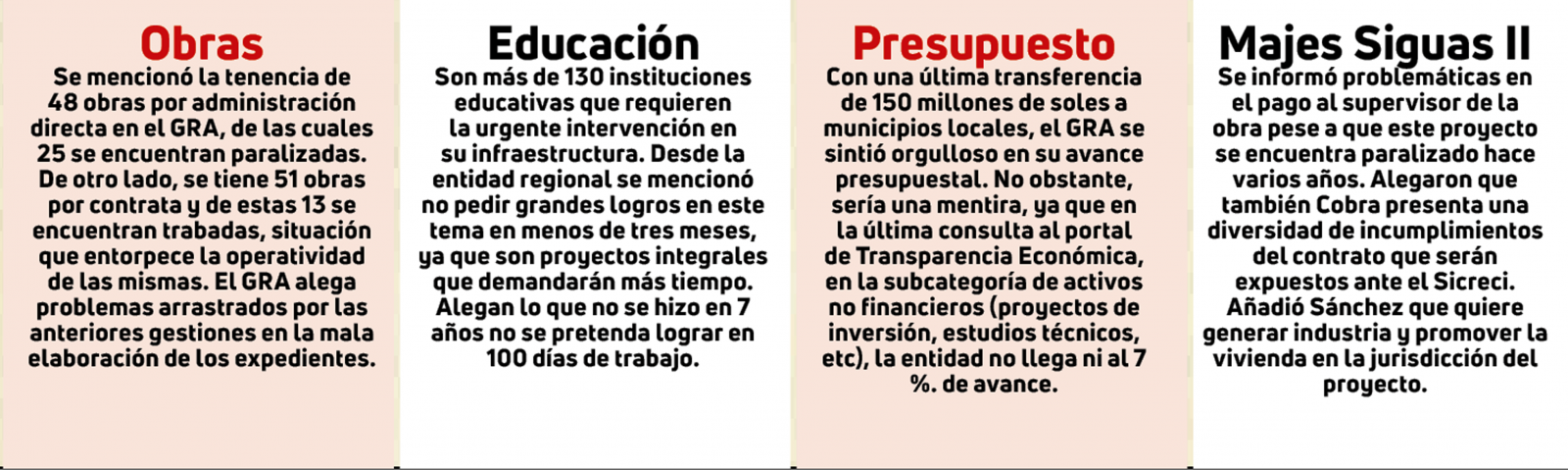 Tibia fue la presentación de los 100 primero días de gestión a cargo del gobernador regional Rohel Sánchez, quien de manera muy general, mencionó el trabajo de sus más de 20 gerencias lideradas por sus funcionarios de confianza. Indicó que respeta la opinión de los pobladores que calificaron como carente su trabajo, no obstante se mantuvo confiado en marcar la diferencia en los próximos meses.