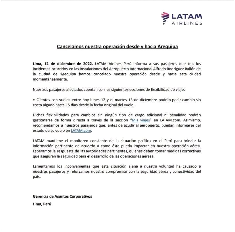“LATAM Airlines Perú informa a sus pasajeros que tras los incidentes ocurridos en las instalaciones del Aeropuerto Internacional Alfredo Rodríguez Ballón de la ciudad de Arequipa hemos cancelado nuestra operación desde y hacia esta ciudad momentáneamente”, indica el cominicado que propaló en sus redes sociales.