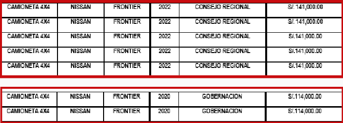 Estos carros pertenecen a áreas como: Gobernación, Vicegobernación, Consejo Regional de Arequipa, Gerencia General, Unidad Funcional de Servicios y Gerencia Regional de Turismo; todas se encuentran en un promedio valorizado de S/1.4 millones.