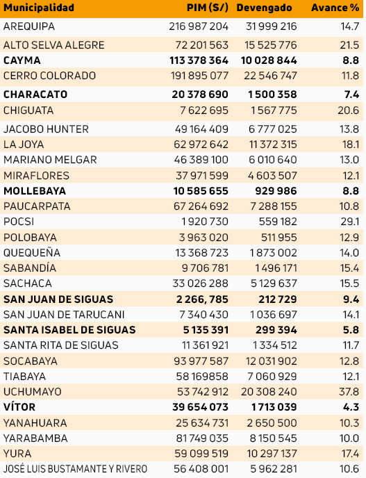 PEORES GASTADORES. Entre los municipios que presentan un irrisorio avance presupuestal se encuentran: Santa Isabel de Siguas, Characato, Mollebaya, San Juan de Siguas, Vítor y Cayma; este último sorprende al ser una comuna de zona urbana y con mucha necesidad. La entidad de alcalde Juan Linares solo gastó el 8.8 % del dinero. Nos intentamos comunicar con el burgomaestre, pero no contestó la llamada.
