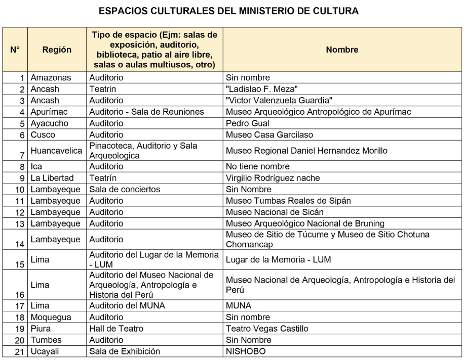 Este año se facilitará el uso temporal y gratuito de espacios para los ensayos y/o la puesta en escena de obras gratuitas o con costo, en museos y museos de sitio, y otros espacios administrados por el Ministerio de Cultura (Mincul) en el Perú. Esto es posible porque se aprobó la creación de la “Red nacional por la promoción de la infraestructura cultural por el teatro”, mediante Resolución Ministerial 000130-2024/MC.