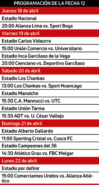 Entre el jueves 18 y el lunes 22 de abril se procederá con la duodécima fecha en el que está se les está prohibido trastabillar. Los celestes, punteros con 28 puntos, recibirán el domingo 21 de abril a Cusco FC en el estadio Alberto Gallardo.