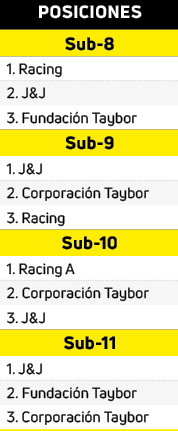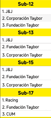 J&J se colgó la de oro en la Sub-9, Sub-11, Sub-13, Sub-13 y Sub-15. Además, se pintó de plata en la Sub-8 y de bronce en la Sub-10. Con relación a Racing, el equipo de Cayma logró el título en la Sub-8 y Sub-17. Añadió en la Sub-9 una de bronce y en la Sub-10 Racing A consiguió el título. Sobre Taybor, el anfitrión conquistó oro en la Sub-11, Sub-13 y Sub-17. Asimismo, cogió bronce en la Sub-8 y Sub-12. Corporación Taybor, en la Sub-9, Sub-10, Sub-12 pescó la de plata, y en la Sub-11, Sub-13 y Sub-15 apresó bronce. Esta misma presea en la Sub-17 se llevó el CUM.