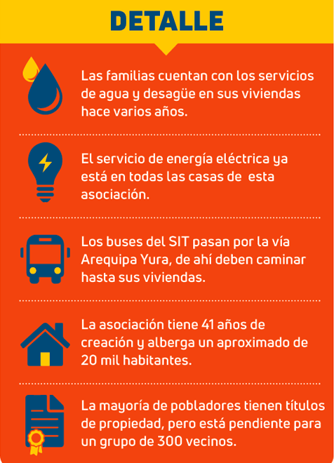 Yura. La asociación urbanizadora Ciudad de Dios es una de las primeras que se formó en el distrito y poco a poco lo fueron poblando. Para sus 4 mil familias fue muy difícil tener que vivir en medio de la nada, sin servicios básicos, transporte público, seguridad y demás.