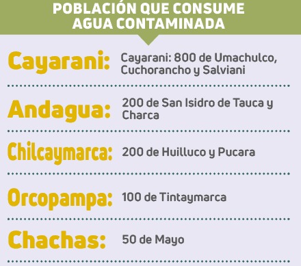 MÁS POBLACIÓN AFECTADA. Un reporte de la Gerencia Regional de Salud de Arequipa (GRSA) expuso que no solo el centro poblado de Umachulco sufre de contaminación hídrica por la minera Poracota, ya que entre los perjudicados también está incluida la población de dos anexos del distrito de Cayarani, provincia de Condesuyos y seis de Castilla (ver cuadro).