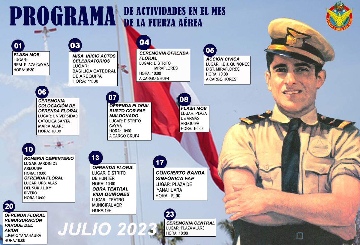 En la reunión se dio a conocer el rol de actividades por la fecha jubilar de la FuerzaAérea del Perú el próximo 23 de julio. Esto en recuerdo del sacrificio del capitán FAP José Abelardo Quiñónes Gonzales.