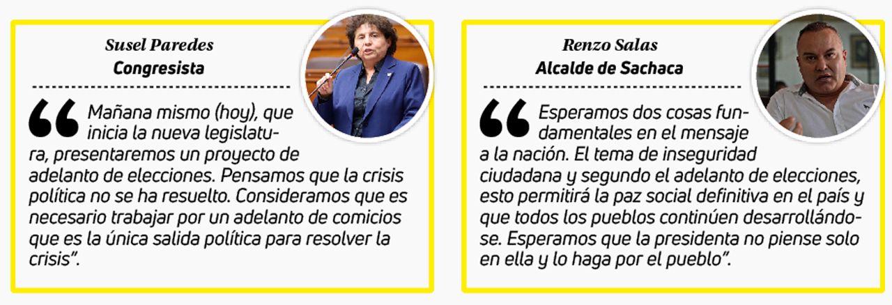 “La mejor solución para el país es que la presidenta anuncie en su mensaje adelanto de elecciones tanto presidenciales como congresales. Es lo más razonable”, refirió Cáceres.