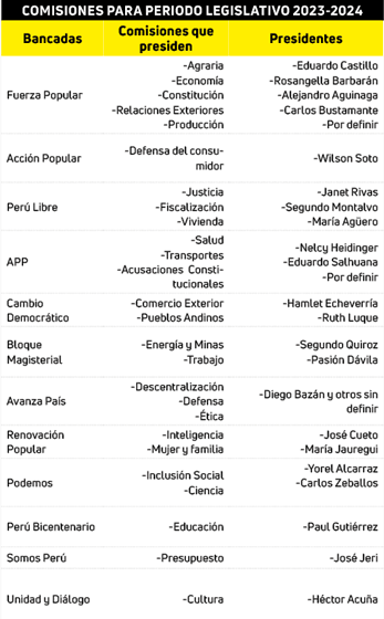Lima. Tras varias horas de debate, la junta de portavoces definió el cuadro de comisiones para el periodo legislativo 2023-2024, que cambió tras las renuncias de parlamentarios de Acción Popular (AP). Fuerza Popular la más beneficiada, mientras que el partido de la lampa solo se quedó con una de tres que tenía.