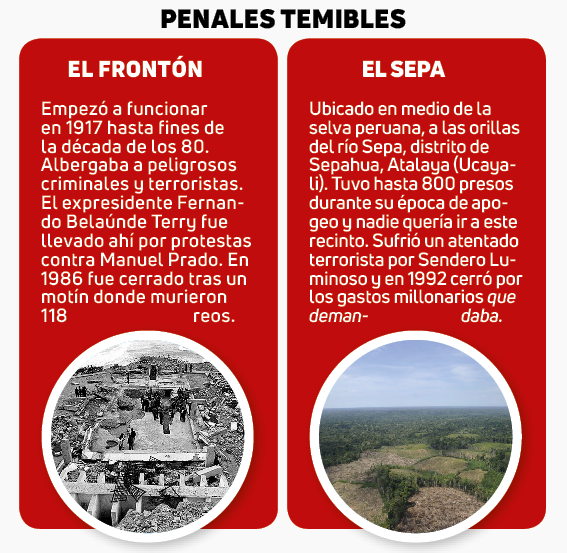Ambas cárceles eran conocidas como las más temibles y están ubicadas en lugares de difícil acceso. En el caso de El Frontón, situado en una isla del Callao, fue cerrado en 1986, luego de un motín en el que murieron al menos 118 internos. Pese a ello, varios funcionarios e incluso congresistas propusieron reabrir, pero nunca se concretó la idea.