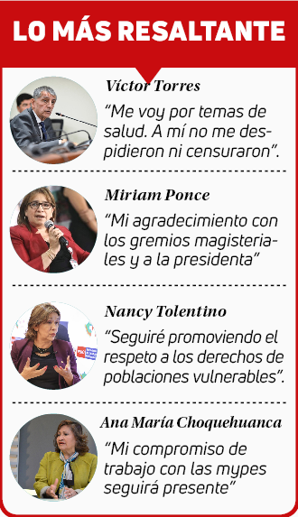 Los tres mencionados fueron los únicos que presentaron su carta de dimisión, mientras que ya en la juramentación se conoció que otros tres también serían removidos: Ana María Choquehuanca, que dirigía el ministerio de Producción, Jennifer Contreras, extitular de Desarrollo Agrario y Riego; y Juan Carlos Mathews Salazar que lideraba Comercio y Turismo Exterior.