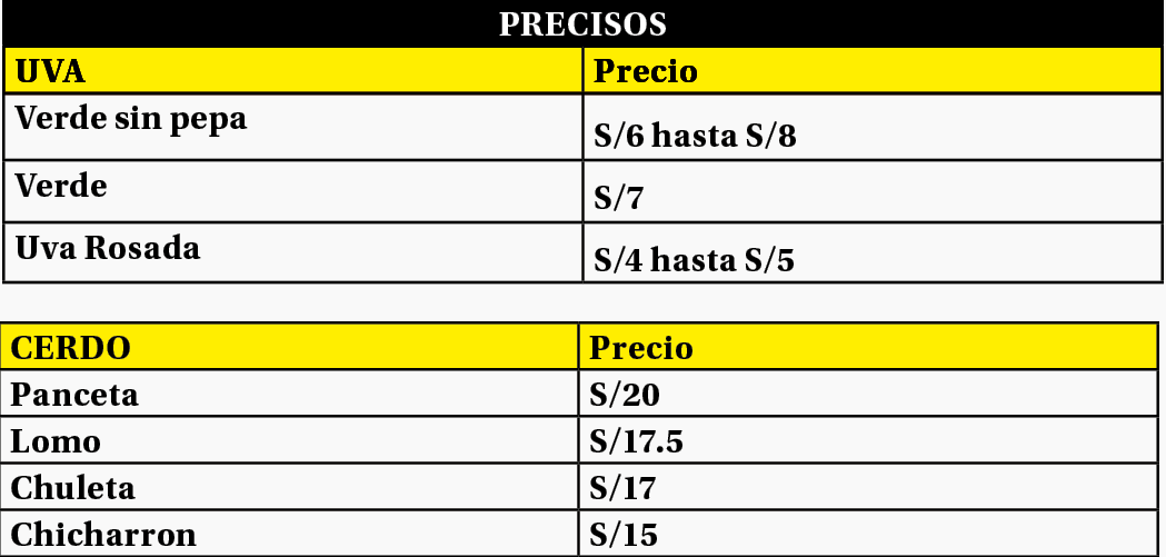 UVA. El precio del kilo de la uva varía de acuerdo a la calidad. El comerciante César Apaza, expresó que el kilo del racimo de uva en el mercado Metropolitano de Río Seco, está desde los S/5, S/7, S/8 y S/9 el kilo del fruta. (Ver cuadro).