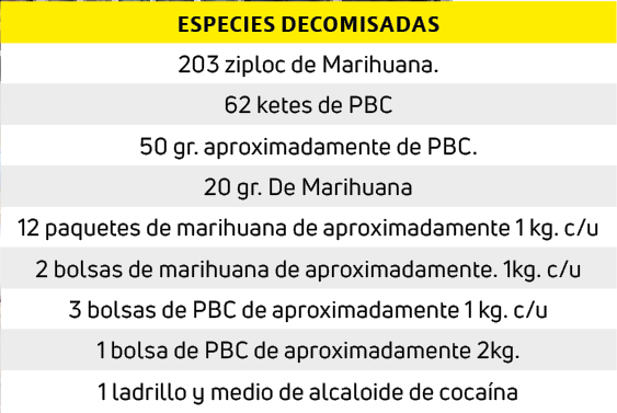 En el operativo la Policía lograron incautar de los inmuebles S/21 520.90, US$60 mil, cien pesos argentinos, un vehículo, 21 equipos celulares y una laptop. El general Sim Galván indicó que la droga era traída por los facinerosos desde Tingo María y Lima.