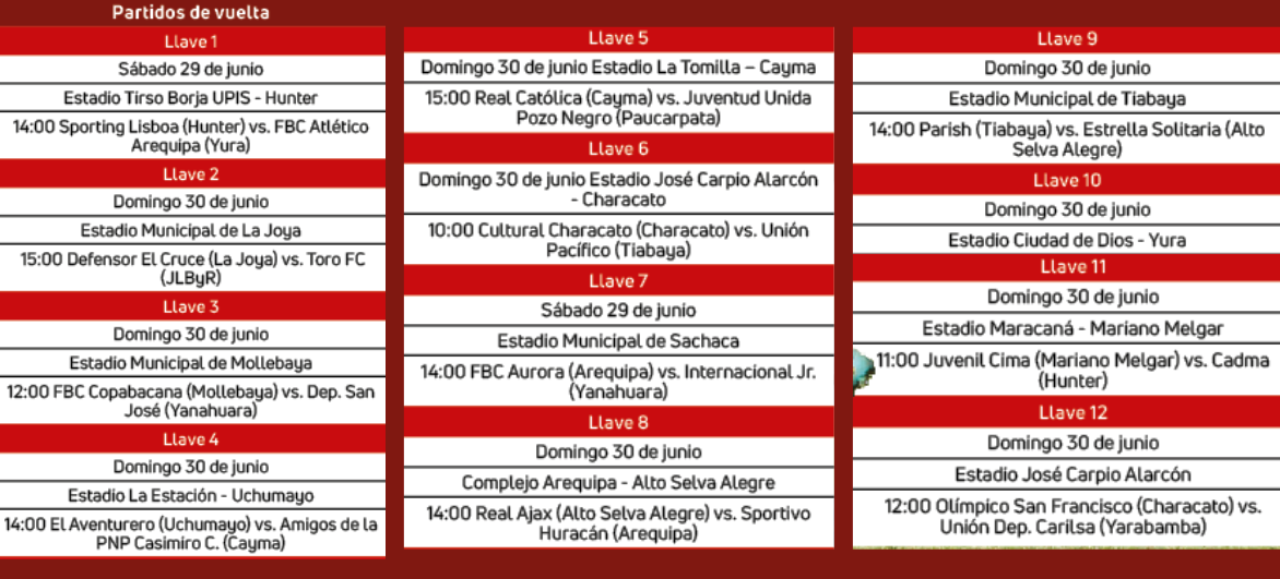 El sábado 29 de junio se disputará dos encuentros, uno de ellos es el que afrontarán a las 14:00 horas, FBC Aurora  frente a Internacional Junior (Yanahuara) en el estadio Municipal de Sachaca. A esa misma hora, pero en el estadio Tirso Borja en Hunter, Sporting Lisboa (Hunter) lidiará ante FBC Atlético Arequipa (Yura). Los otros diez partidos de vuelta de las respectivas llaves se completarán este domingo 30 de junio.