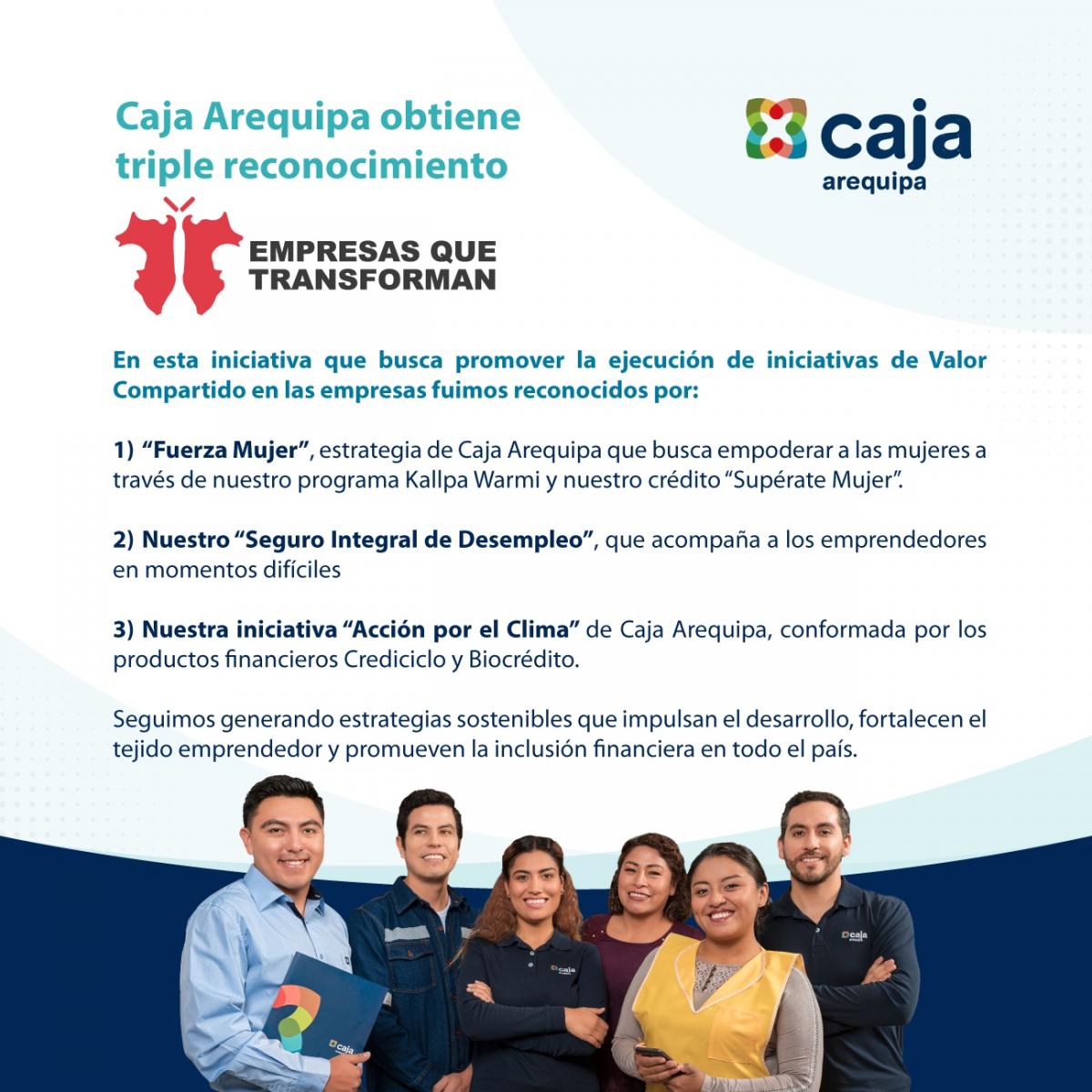 En la quinta edición de Empresas que Transforman, Caja Arequipa obtuvo un triple reconocimiento por tres iniciativas emblemáticas que generan valor compartido y mejoran la vida de miles de peruanos.