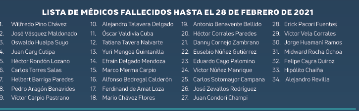 MÉDICOS FALLECIDOS. En 2020, el Colegio Médico reportó la primera muerte de uno de sus colegas, se trató del doctor José Luis Vásquez Maldonado. Ese año concluyó con la lamentable cifra de 30 fallecidos. Un año después, 2021, la cifra aumentó, siendo el más recordado Hipólito Chaiña, conocido como el “Médico del pueblo”, en ese periodo era congresista. (Ver listado)