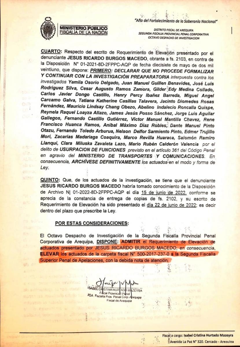 Sin embargo, luego que se interpuso el recurso de derecho, el fiscal superior le dio la razón sobre su pedido y anuló la disposición de archivamiento, así mismo le indicó a la fiscal que emita una nueva disposición en la cual no solo haga la anulación, sino que también eleve el expediente al despacho del fiscal superior a fin de analizar el tema de fondo de la denuncia, vale decir, si el denunciante tiene razón en los argumentos y los hechos probatorios, así como las pruebas respecto a la acusación que ha realizado Burgos.