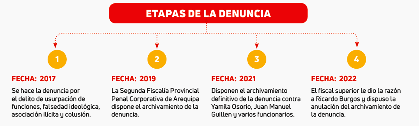 Arequipa. La denuncia contra la exgobernadora regional Yamila Osorio y el expresidente regional, Juan Manuel Guillén, y funcionarios de ambas gestiones sigue vigente, a llos se les investiga por los delitos de usurpación de funciones, falsedad ideológica, asociación ilícita y colusión.