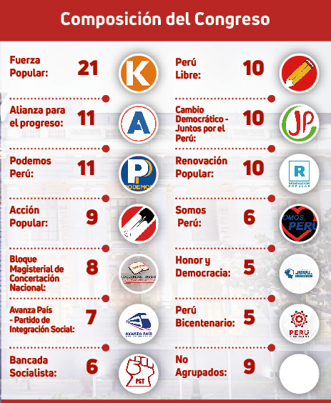 Mientras que en el caso de Fuerza Popular, que ahora es la fuerza mayor en el Congreso, entró con 24 y ahora tiene 21 parlamentarios. La lideresa y presidenta Keiko Fujimori, expulsó a María Cordero, quien fue acusada de mochar salarios. Otro renunciante fue su hermano. Mientras que cuenta con un fallecido; Hernando Guerra. El partido Morado también obtuvo tres escaños, pero todos renunciaron. Su presidente Luis Alberto Durán pidió disculpas a la población, sobre todo hizo énfasis en su excolega Edward Málaga.